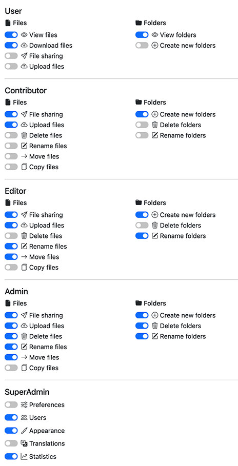 - Update password, username, role, e-mail, assign dedicated folder(s) for all pre-existing Users, and set a maximum available space